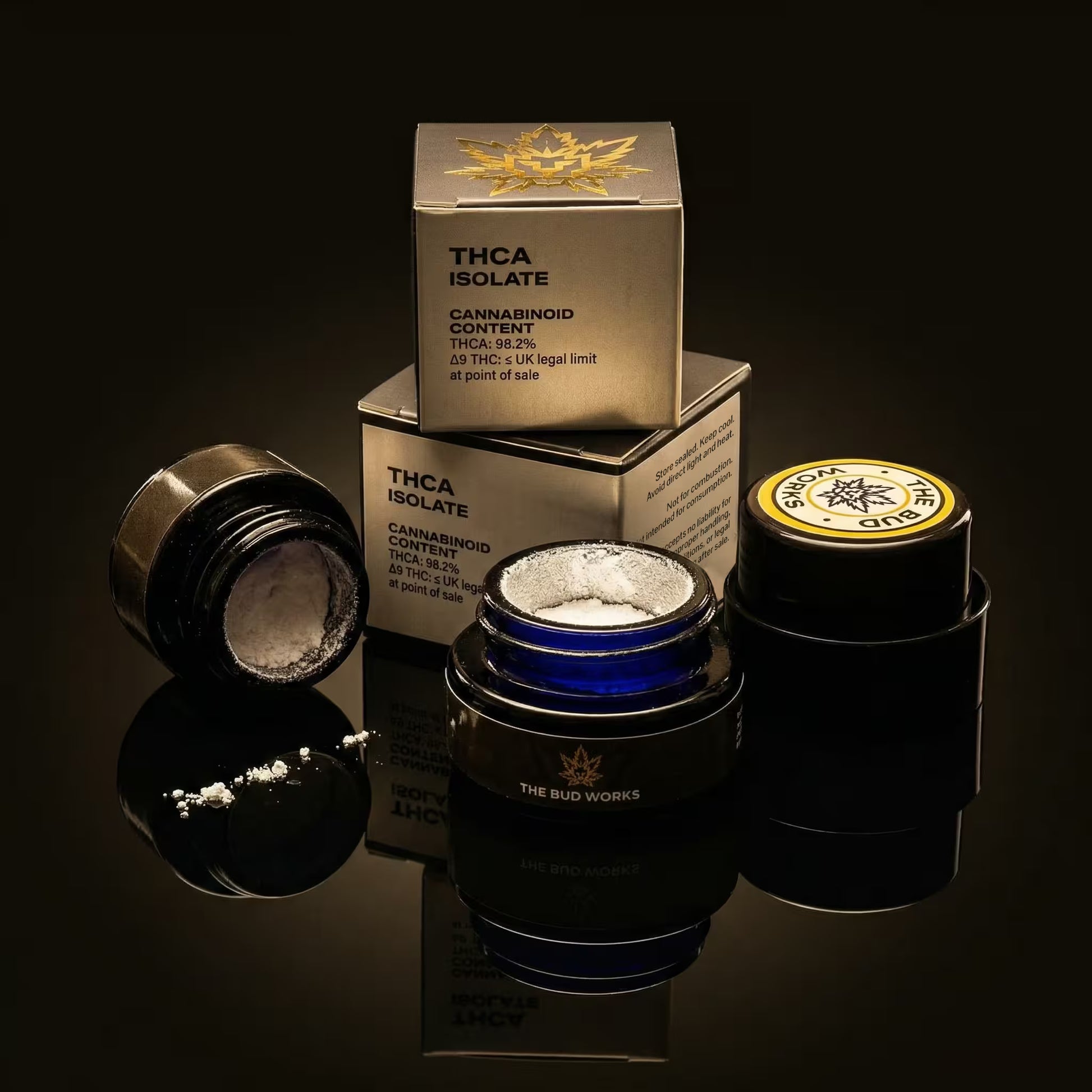 It contains THCA in its non-decarboxylated form, which is not listed as a controlled substance under the Misuse of Drugs Act 1971 when supplied within applicable Δ9-THC limits.